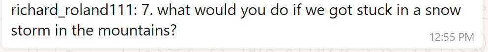 6. They ask really mundane questions (again, SCRIPTED!) in the beginning. They do this to pretend they are truly interested in you. Achmed wanted to know what my favorite color is and what my favorite ice cream flavor is. Again, it’s all scripted! Another question he asked me was, “if you could go anywhere in the world, where would you go and try why ?” (Again, notice the capitalization and syntax errors.) Yes, their crappy scripts also have typos!